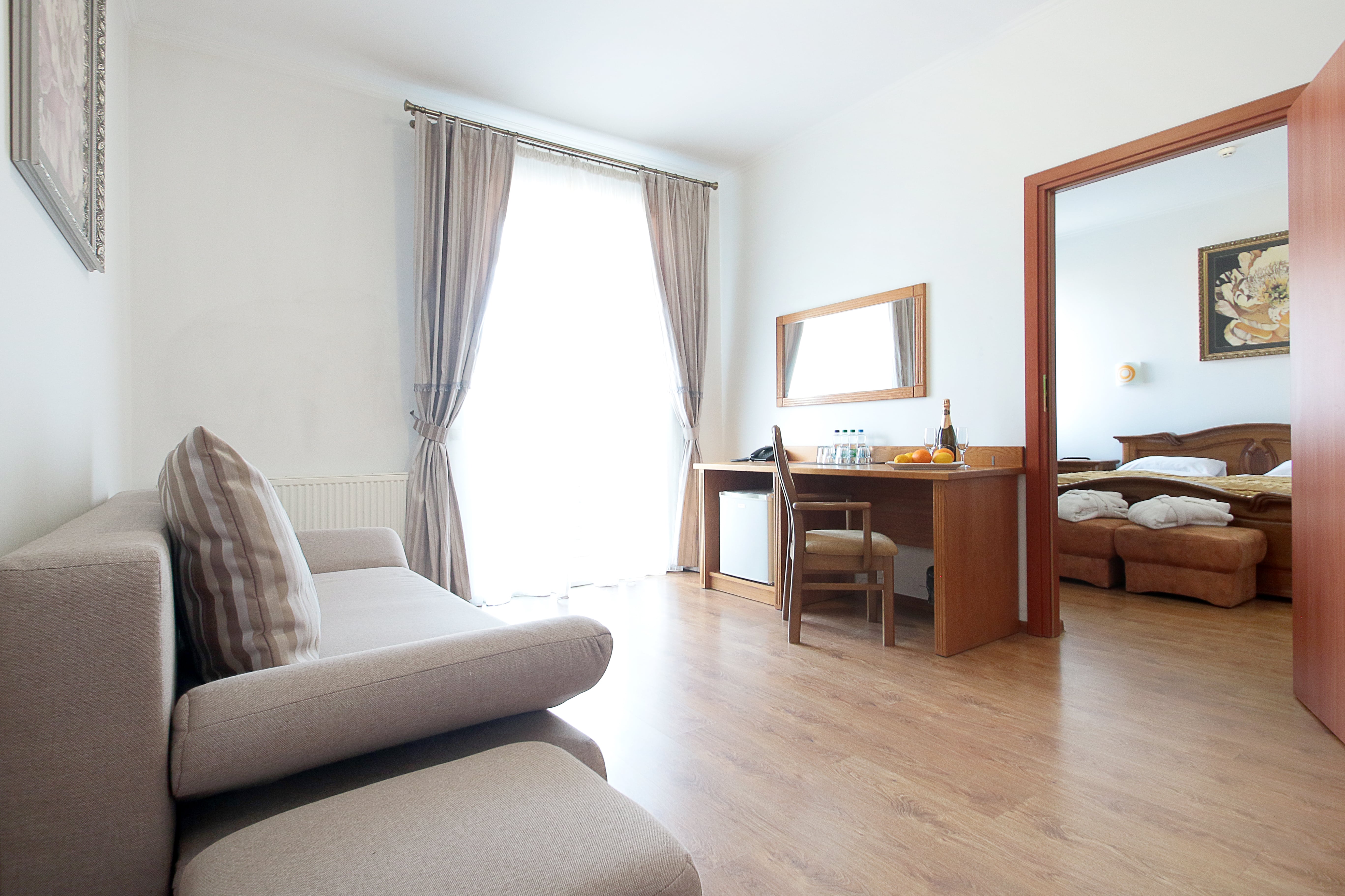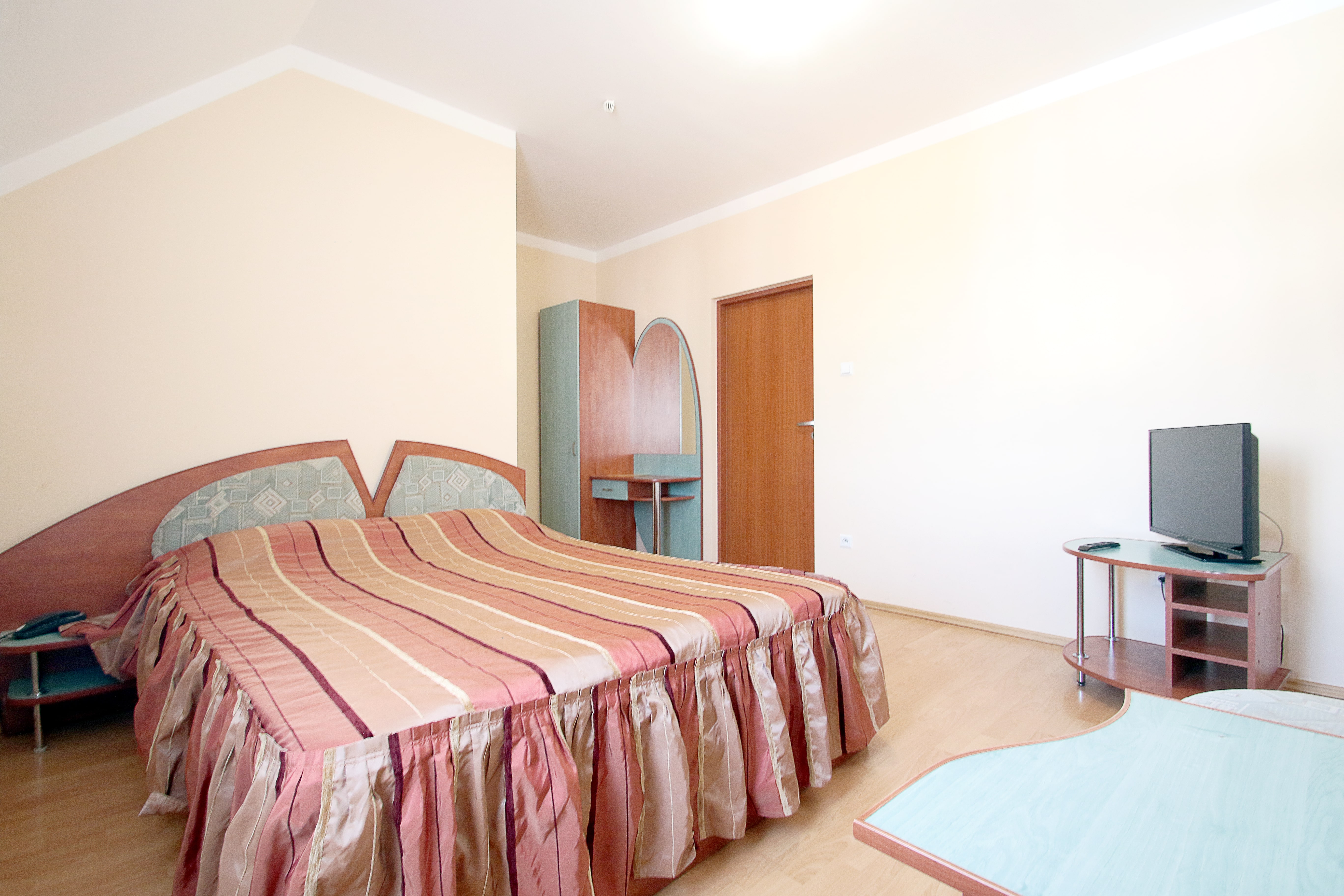 Комплектація Номеру: Двокімнатний номер, Двоспальне та односпальне ліжко, стіл, два пуфа,